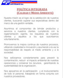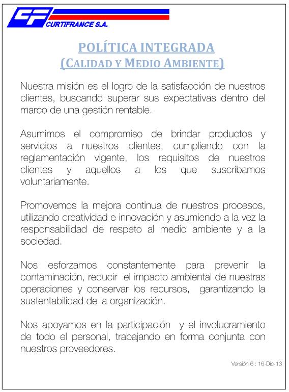 Nuestra misión es el logro de la satisfacción de nuestros clientes, buscando superar sus expectativas dentro del marco de una gestión rentable. Asumimos el compromiso de brindar productos y servicios a nuestros clientes, cumpliendo con la reglamentación vigente, los requisitos de nuestros clientes y aquellos a los que suscribamos voluntariamente. Promovemos la mejora continua de nuestros procesos, utilizando creatividad e innovación y asumiendo a la vez la responsabilidad de respeto al medio ambiente y a la sociedad. Nos esforzamos constantemente para prevenir la contaminación, reducir el impacto ambiental de nuestras operaciones y conservar los recursos, garantizando la sustentabilidad de la organización. Nos apoyamos en la participación y el involucramiento de todo el personal, trabajando en forma conjunta con nuestros proveedores. Versión 6 : 16-Dic-2013