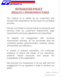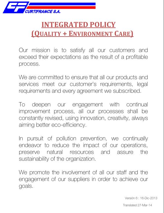 Our mission is to satisfy all our customers and exceed their expectations as the result of a profitable process. We are committed to ensure that all our products and services meet our customer's requirements, legal requirements and every agreement we subscribed. To deepen our engagement with continual improvement process, all our processes shall be constantly revised, using innovation, creativity, always aiming better eco-efficiency. In pursuit of pollution prevention, we continually endeavor to reduce the impact of our operations, preserve natural resources and assure the sustainability of the organization. We promote the involvement of all our staff and the engagement of our suppliers in order to achieve our goals. Version 6: 16-Dic-13